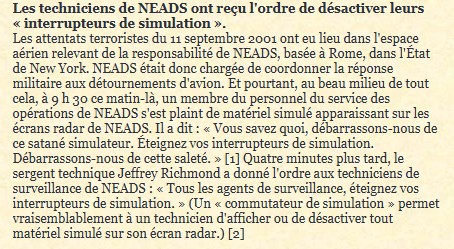 Maintenant, qu'il y ai eu, le 11 septembre, un exercice mis en place dans l'intention de nuire à une intervention rapide des forces aéronautiques militaire, j'en doute puisqu'il y a eu des actions pour interrompre cet exercice.