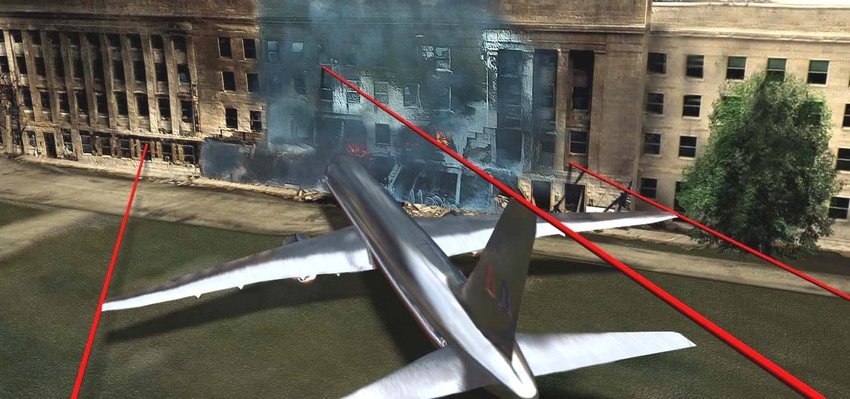 Come sappiamo, nella parte superiore della facciata del pentagono manca il danno del timone di coda verticale. L’aereo può essere andato più in basso? No, altrimenti avremmo i solchi dei due massicci motori sul prato. Ma anche ai lati i danni non tornano un granchè: l’apertura alare di un 757-223 è di 38 metri, ma il danno orizzontale sulla facciata lungo la proiezione del percorso dell’aereo è stato misurato dai pompieri giunti sul posto come largo 27!