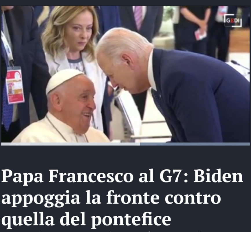 Questa cosa non la trovo scritta neanche da chi sta ed in questi due anni ha sempre lottato contro il genocidio dei palestinesi. Scherzare coi carnefici non è carità cristiana. Non credo. Piuttosto ipocrisia. Se sono il Papà non vado al G7 dai potenti dell'occidente, piuttosto prendo un motoscafo e mi faccio portare sulla costa di Gaza. E dimostro a tutti che quello che sta succedendo è a due passi da noi. Io penso così. Per carità, magari sbaglio, ma la vedo così. Faccio lo slalom tra le portaerei davanti a Gaza messe lì da Biden a sorvegliare il genocidio, mi pianto una tenda sulla spiaggia, e non mi muovo da lì. Sparino pure.