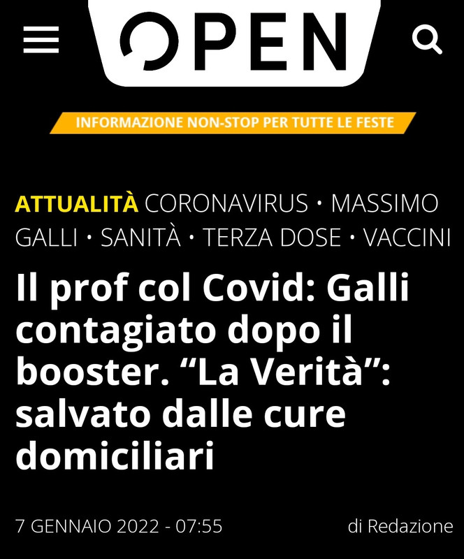 Ma soprattutto, che secondo te questa e' la notizia del giorno. Addi', 6 gennaio 2022: qualche ora dopo l'annuncio da parte del governo di mettere un obbligo di massa su un trattamento sanitario sperimentale che - ormai lo dicono pure loro - nemmeno ferma la diffusione del coso. E la necessita' di un robo chiamato green pass per andare in posta e in banca.