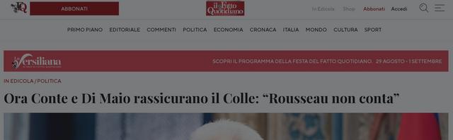Ieri Sertes ha dato la notizia "Ora Conte e Di Maio rassicurano il colle: Rousseau non conta." Non mi stupisce più nulla ormai, ma volendo concedere il beneficio del dubbio vado a cercare nel sito del fatto, che come risultato alla ricerca "rousseau" mi da: Quindi non è vero, mi dico, stanno tentando di screditare i 5* guarda dicono che al contrario "Governo, M5s ribadisce: “Il voto su Rousseau conta. Stiamo lavorando al programma e poi ci atterremo alla decisione degli iscritti”.......... Memore delle supercazzole pentastellate (non le hanno certo inventate loro, ma diciamo pure che ci sguazzano allegramente) faccio una ricerca più mirata e allora cerco la frase esatta "ora conte e di maio rassicurano il colle" Eccallà, Fatto! Cercavi di nasconderla? D'Esposito e Zanca devono essere due cazzari che si divertono a gettare fango sui nostri eroi, non c'è altra spiegazione.