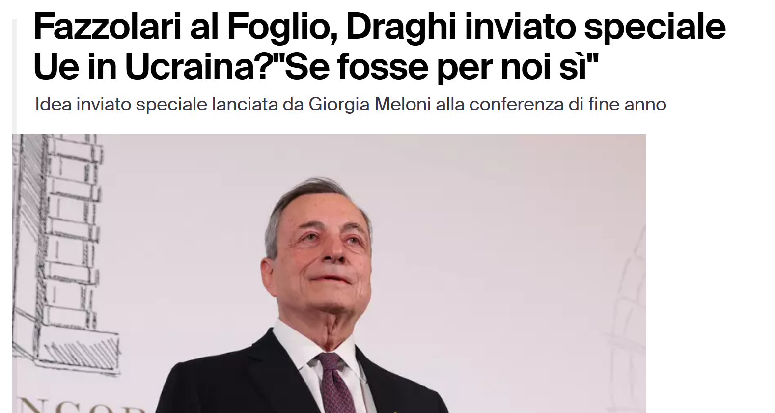 E’ Draghi. Lo dice al Foglio Giovanbattista Fazzolari [Fratelli d'Italia ndr] Mario Draghi (www.ilfoglio.it/tag/mario-draghi/) può essere l’inviato speciale Ue in Ucraina? “Sì, se fosse per noi, sì”. La figura perfetta per ricoprire la carica di inviato speciale in Ucraina è l’ex premier, ex presidente della Bce. Durante la conferenza stampa di fine (inizio) anno, Meloni ha dichiarato: “Penso che Macron abbia ragione, credo sia il momento in cui anche la Ue parli con la Russia, ma se l’Europa decide di parlare solo con una delle due parti in campo temo che il contributo sia limitato. Il problema è chi deve farlo”. Aggiunge Meloni: “Sono favorevole all’indicazione di un inviato speciale della Ue sull’Ucraina”.