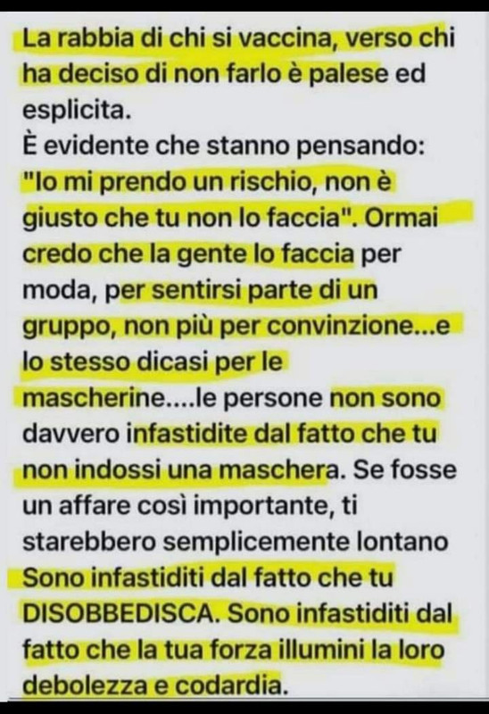 Anzi proprio oggi pensavo che nel momento in cui il liquame divenisse davvero obbligatorio, preferirò rifiutare e farmi internare ...per ripicca e perchè non rinuncerò mai ai miei principi fondamentali, soprattutto se imposti da una banda di politici ignoranti. Allora si che sarò un martire immolatosi per per salvare gli altri.