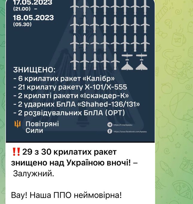 ieri a Kiev abbiamo visto 30 lanci, viste le foto diamo per scontato siano Patriot, questo significa che OTTO lanciatori hanno partecipato alla difesa e lanciato (oppure c'è l'ipotesi dei due lanciatori multipli preassemblati da 16, ma non sono mai stati osservati in Ucraina, che comunque non torna con i video ma si può ragionare in termini di 16+4+4+4+4). Dai video non risultano altri lanci da batterie fuori città, quindi prendiamo per buona l'idea che l'intera fornitura di patriot abbia partecipato all'azione. In pratica l'intera serie di missili pronti è stata lanciata, finita quella non c'è altro a difendere Kiev se non Nasams e Iris-t (e nel video dell'impatto Kinzal, quello ripreso sei minuti dopo il lancio Patriot, si vedono bene in azione).