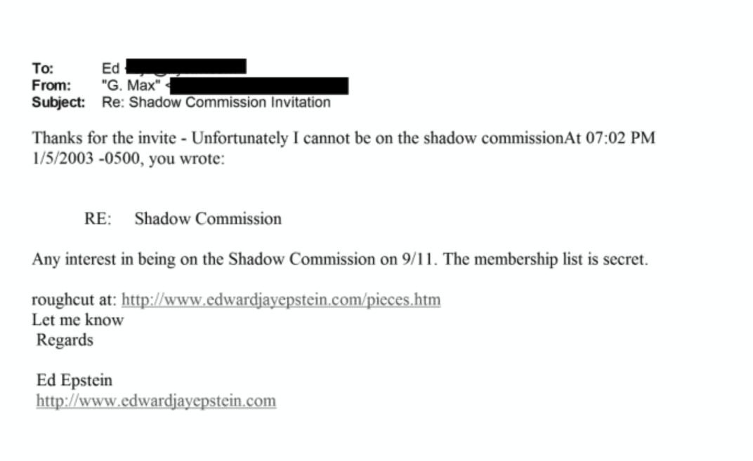 9/11 SHADOW COMMISSION ... il termine "9/11 Shadow Commission" (o "commissione ombra sul 9/11") sta circolando tantissimo su X in questi giorni (febbraio 2026), soprattutto dopo la pubblicazione di nuovi documenti del DOJ legati al caso Epstein.Ecco cosa emerge dalla roba che gira lì:Nel 2003 (quindi circa un anno e mezzo dopo gli attentati e prima che la commissione ufficiale fosse pienamente operativa), il giornalista investigativo Edward Jay Epstein (uno che ha scritto libri su intelligence, JFK, Hollywood e cospirazioni varie) ha mandato un'email a Ghislaine Maxwell invitandola a partecipare a una "shadow commission on 9/11".