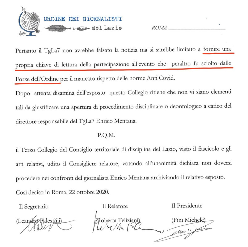 L’esposto viene inviato il 29 settembre 2020 all’Agcom (Autorità per le garanzie nelle comunicazioni) e all’Ordine regionale dei giornalisti del Lazio. L’iniziativa è finanziata dal Fondo No Bufale (www.nobufale.it).