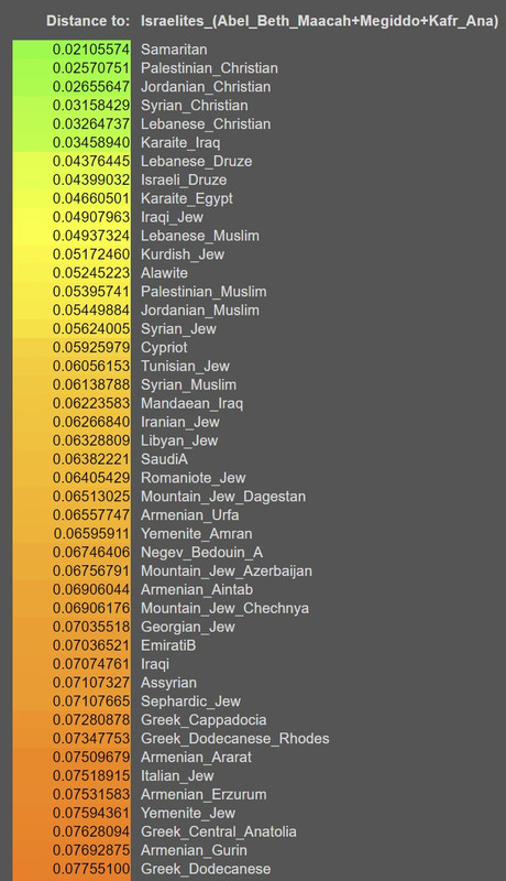 (Le distanze genetiche di circa 0,02 indicano popolazioni praticamente geneticamente indistinguibili, di circa 0,05 popolazioni appartenenti allo stesso raggruppamento genetico regionale (slavi, scandinavi...), intorno allo 0.10 implica il margine di differenziazione in ammassi "razziali" (asiatici, europei...))