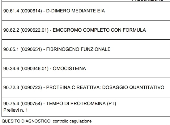 Il tuo dottore probabilmente ti chiederà perchè fai l'esame del d-dimero e della melioperossidasi e a mio cognato (per i sieri) non lo ha inserito e quindi ha pagato gli esami.