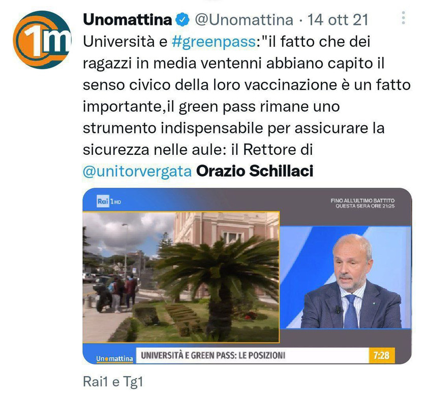 La conduttrice gli ha appena finito di dire che una ragazza che si è rifiutata di mostrare il"green pass all'università è stata sospesa e lui, con la faccia come il culo, ha il coraggio di dire che è cosa buona e giusta che il 90% degli studenti universitari abbia scelto liberamente di vaccinarsi ... e poi ha aggiunto che così facendo i giovani hanno mostrato senso civico, vaccinandosi per proteggere i più fragili! Merda allo stato purissimo.