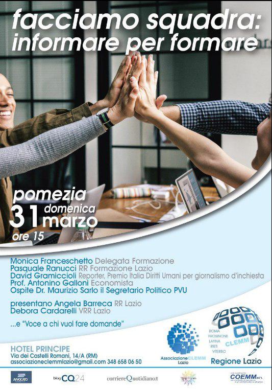 Domenica 31 marzo alle 15,00 sarò alla giornata conclusiva della Formazione degli appartenenti ai Clemm LAZIO per ottenere il Microcredito; i ns. Referenti saranno lì dal 29 per una formazione più completa e richiesta per il loro compito, mentre per i "Capitani" e per tutti gli Ospiti dei nostri Salotti, è sufficiente solo il 31 pomeriggio. Gli argomenti trattati sono interessanti per molti,si parla dei diritti umani, della moneta e tanto altro...