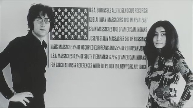 Comunque, poiché mia figlia ha giusto in programma un esame di storia dell'arte e l'altra sera a cena si blaterava di Fluxus, mi sento in vena di condividere con voi quest'immagine di John Lennon e Yoko Ono nel 1970 davanti all'opera "Genocide flag" di George Maciunas del 1966.
