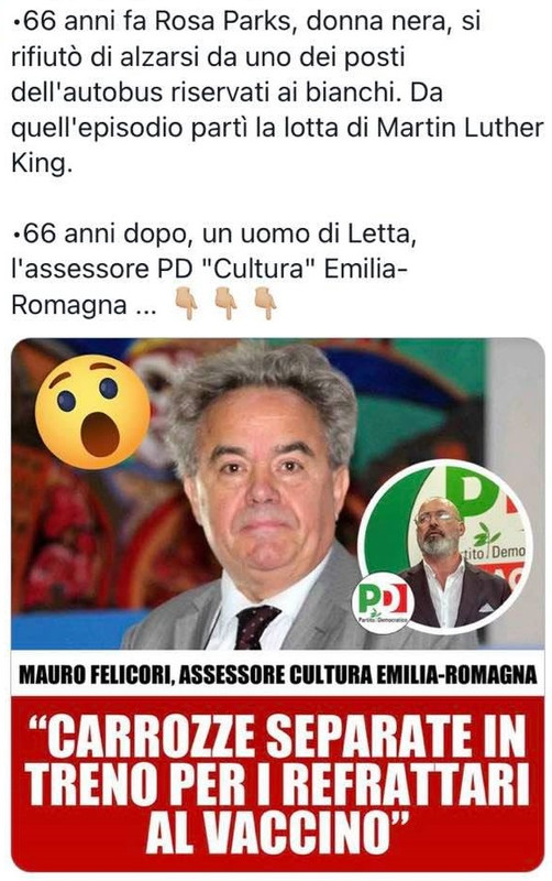 In ogni caso, la cosa peggiore partorita dal signore in questione, circa un anno fa, è stata l'equiparare gli oppositori delle misure anti-covid a dei malati mentali. Si tratta di un caso palese di patologizzazione del dissenso, altra pratica tipica di un regime totalitario. Essa apre scenari inquietanti: il dissidente è in fondo un malato mentale, non in grado di intendere e di volere e per questo passibile di arrecare danno a sè e agli altri. In tal caso appare del tutto lecito non solo ignorare le istanze politiche di cui il dissidente si fa portatore, ma anche adottare l'opzione del Tso, esattamente come si fa con gli squilibrati che operano atti di autolesionismo o danneggiano chi sta loro attorno.
