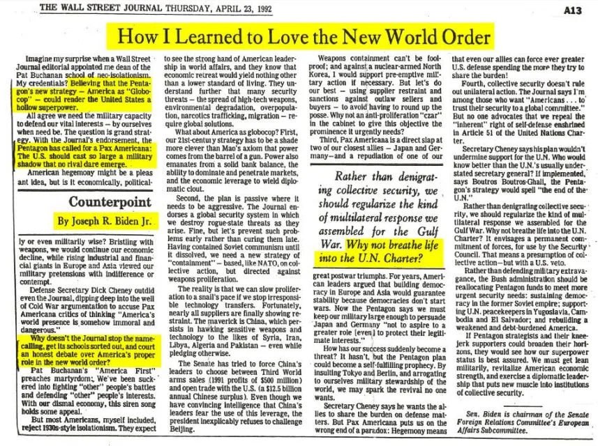 Il 23 aprile 1992, il Wall Street Journal ha pubblicato un articolo di Joe Biden intitolato "Come ho imparato ad amare il Nuovo Ordine Mondiale", in cui Biden rivela la sua fedeltà all'agenda del NWO.