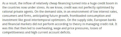 Non ci siamo capiti. Quello che afferma l'analisi della BCE del 2013 non è che le banche italiane hanno prestato i soldi incautamente ma che lo hanno fatto le banche dei paesi "core" dell'area euro. E, quello che non dice, ma che si desume dal ragionamento è che esse abbiano commesso un azzardo morale, convinte del fatto che qualcuno le avrebbe salvate, imponendo ai contribuenti dei paesi in crisi il peso del rimborso dei loro crediti.