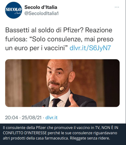 Ora, di quali illuminanti pareri avranno potuto mai necessitare enormi aziende farmaceutiche, già strapiene di consulenti interni, da un professionista così noto e importante - come lo era a quel tempo - e decisivo, come Sua Nefandezza Bassetti?