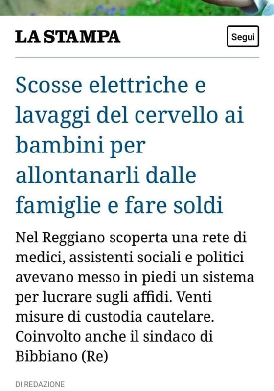 Diciotto persone, tra cui il sindaco Pd di Bibbiano Andrea Carletti, politici, medici, assistenti sociali, liberi professionisti, psicologi e psicoterapeuti di una Onlus di Torino sono stati stati raggiunti da misure cautelari dai carabinieri di Reggio Emilia. Al centro dell’inchiesta ‘Angeli e Demoni’, coordinata dal sostituto procuratore Valentina Salvi, la rete di servizi sociali della Val D’Enza, accusati di aver redatto false relazioni per allontanare bambini da famiglie e collocarli in affido retribuito da amici e conoscenti."