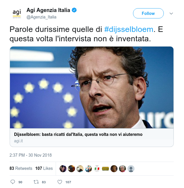 "Il segnale della Ue deve essere chiaro: non ci lasciamo ricattare dal governo italiano". Lo dice l'ex presidente dell'Eurogruppo, Jeroen Dijsselbloem, in una intervista anticipata dal sito di Der Spiegel e che sarà pubblicata domani. Secondo Dijsselbloem, "se l'Italia perde l'accesso ai mercati finanziari, l'Europa non potrà salvarla".