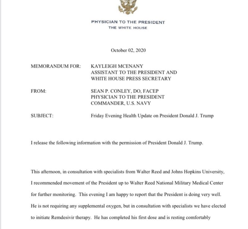 Trump in ospedale per qualche giorno in via"precauzionale" e dopo aver consultato gli esperti della Hopkins University si è sparato la prima dose di remdesivir, nonostante i sintomi lievi.