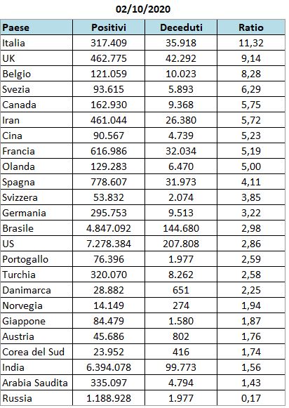 Va anche detto che questa "ratio" è piuttosto inutile come indicatore perchè dipende dal numero di tamponi fatti alla popolazione, non a caso la Spagna era in quel periodo fra le nazioni che facevano più test pro capite e la Francia fra quelle che ne facevano meno.