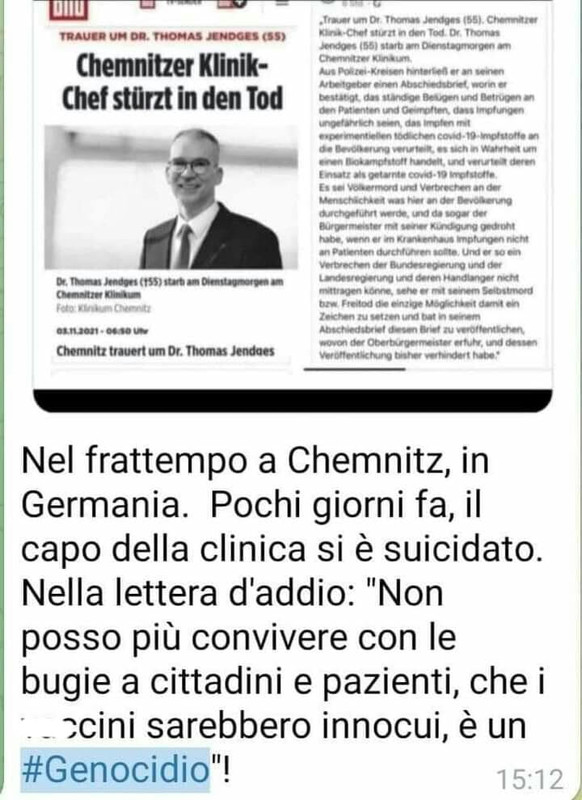 -oggi esco e incontro un amico mio.. Mimmo, barista all'Hotel; mi dice l'hai fatto il vaccino?" " Si col caxxo, manco morto!". Sai" neanche io l'ho fatto, ho avuto i coviddi, io e mia madre; io non me ne sono neanche reso conto ma poi m'hanno fatto il tampone e l'ho saputo; mamma è stata in ospe un mese ed è stata male. Poi l'abbiamo portata in una clinica, e li l'hanno rimessa apposto.. compresi tutti gli altri problemi di salute che aveva. Quando è stata li, almeno avevo la possibilità di vederla col cellulare quasi tutti i giorni"! "Quindi, mi sono fatto la quarantena, non ho fatto il V perchè ho già gli anticorpi ma a mia madre quel coglione del mio medico curante, l'ha fatto di nascosto.. tanto stava per andare in pensione! Che caxxo ne sa mia madre a 84 anni di V. consenso informato, ect ect. il fatto che aveva già gli anticorpi avendo avuto il covid!" "l'ha vaccinata senza che io e mio fratello ne sapessimo niente!" "il mio amico che conosco ..dovo lavoro io, dopo 3 mesi dal coviddi invece ha fatto il V!" "ora sono 4 mesi che va da uno specialista all'altro perchè non sanno cosa cavolo abbia!" "Gli ho detto , ma scusa, se hai avuto la malattia e ne sei uscito hai gli anticorpi, perchè ti sei V.?" e lui "il medico mi ha detto che dovevo farlo!".