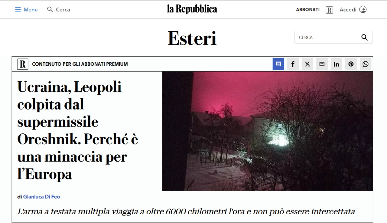 Così si capisce a pieno che l'attacco Oreshnik è politico e non militare. Serve a dare una svegliata ai volenterosi carnefici di Ursulina Cara. Dice C&S: "possiamo colpire con una precisione millimetrica anche a ridosso dei confini NATO e tutto senza allertare il vostro sistema di controllo delle minacce nucleari, sentitevi vetrificati senza preavviso"