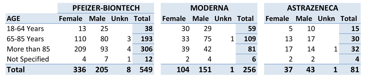E' vero che hanno somministrato più dosi di Pfeizer e forse anche di Moderna, ma i numeri (probabilmente sottostimati) sono comunque elevati: oltre 550 per Pfeizer, oltre 250 per Moderna e oltre 80 per Astrazeneca.