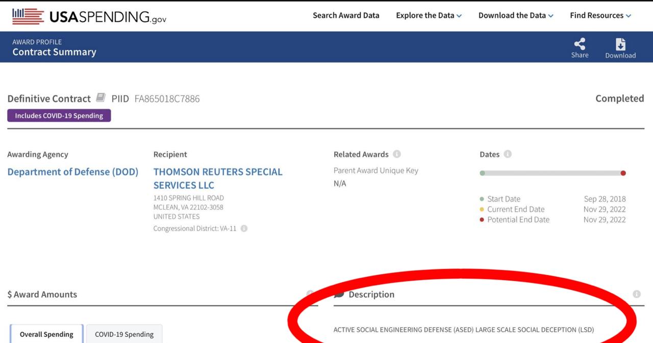 Chissà cos'erano questi misteriosi pagamenti di DARPA al gigante dell'informazione Gruppo Reuters per un "Programma d'ingegneria sociale" intitolato "Inganno sociale su larga scala 2018 - 2022"?