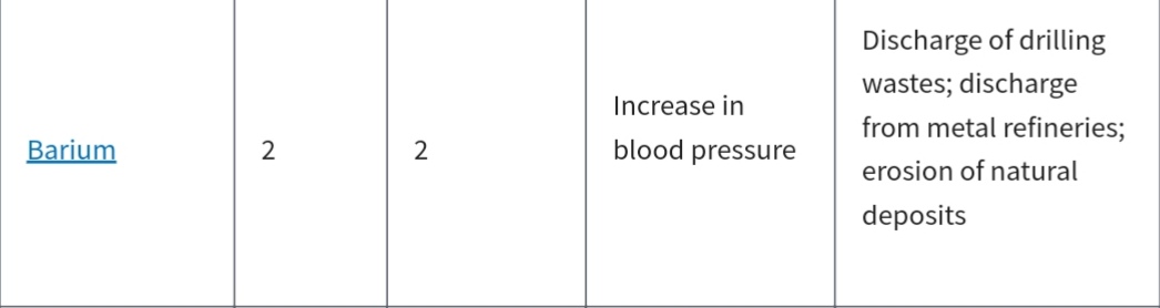 Passiamo al Bario. Qui le cose cambiano, perché il bario è un NPDWR (regolatore chimico primario), ovvero sono dannosi a lungo termine per la salute se presi costantemente sopra la soglia.