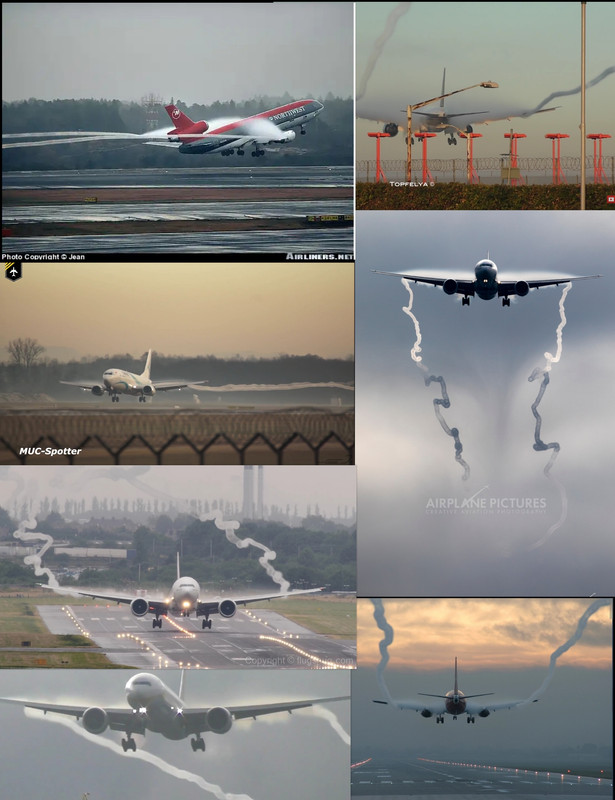 Quella che vedi non è una scia aerodinamica lunga semplicemente per la temperatura esterna. Le scie aerodinamiche (quelle dalle ali) iniziano a diventare lunghe solo quando raggiungono il Freezing point ovvero quasi sempre solo in volo. Durante l'atterraggio non fa in tempo a crearsi che subito si "scioglie".
