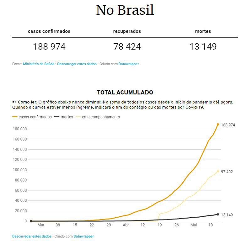 Il Brasile, fino a oggi, ha circa 13.000 morti in conseguenza del Covid-19 – qualcosa come 0,006% dei 230 milioni di abitanti. Il numero totale degli “infetti” in questi ultimi due mesi è stato di circa 180 mila.