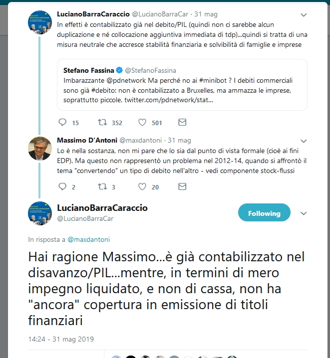 2) Borghi sa perfettamente che i minibot fanno parte del debito pubblico. Tra l'altro nei fax simili c'è scritto BUONI DEL TESORO, spacciarli per altro diventa complicato