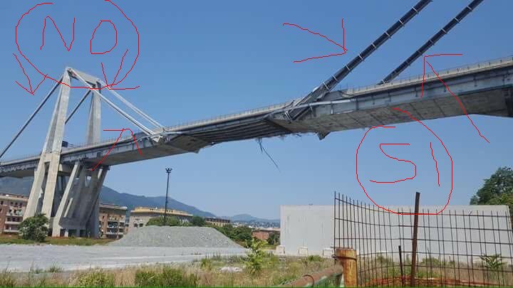 Sarebbe utile capire la direzione del il collasso delle due "A". Inoltre avrebbe ancora più senso se la parte che ha ceduto non fosse lo strallo ma una o più delle travi a sostegno del piano stradale, avrebbe lasciato tutto il peso agli stralli e da li si che ti tira giu le due "A". Quindi se il cedimento avviene qui: