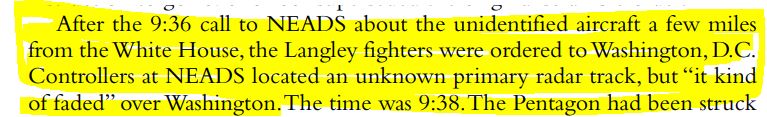 E poi spiegami tra le 9:30 e le 9:37 cosa stava effettivamente volando nei cieli e si stava avvicinando minacciosamente al pentagono?