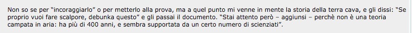 Quindi se vuoi cominciare a riportare la verità su Wikipedia, come hai detto, comincia con lo scrivere che Mazzucco non ha mai sostenuto la teoria della Terrra Cava ma ha semplicemente invitato attivissimo a debunkarla, avvisandolo che è una teoria in voga da 400 anni.