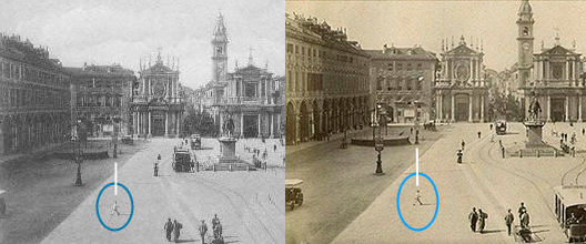 La "buonanima" (perché sarà passato a miglior vita da decenni), riflettendoci, avrà capito che il Tram era troppo lontano dall'inquadratura (l'ombra della "trazione equina", pur essendo occultata dalla visuale, potrebbe tranquillamente esserci) quindi lo ha "arretrato" volontariamente (lasciando nella stessa posizione i passanti "congelati"):