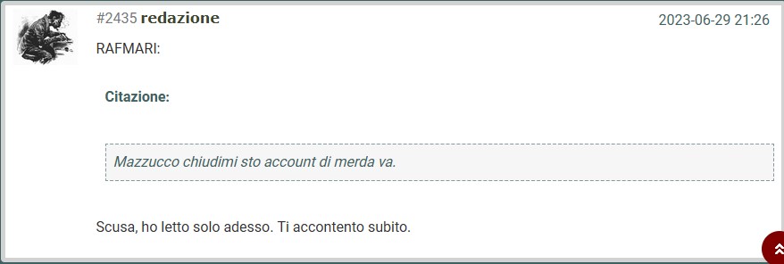 Son riuscito a postare il post di prima e mi fa anche fare l'edit, ma solo quello con le maledizioni no, per cui poco male, ma prima di rischiare di scrivere a vuoto dovevo fare una prova.