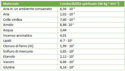 Di seguito sono elencati i valori di conducibilità spirituale di alcune sostanze.