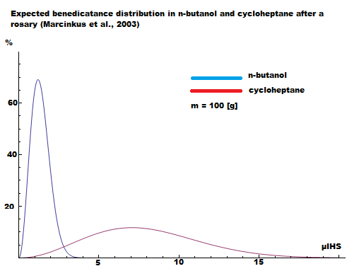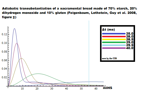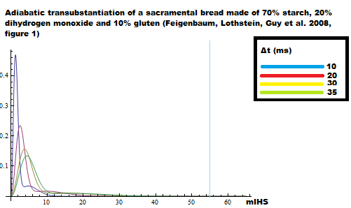 A t = 0 non vi è benedittanza ma col procedere della benedizione il suo valore comincia a crescere, e per qualche molecola sarà di più e per qualche molecola di meno, ma globalmente cresce. La "coda" che vedete allungarsi a destra del grafico è il glutine: esso si consacra tanto facilmente che un numero non infinitesimo di sue molecole raggiunge, poco dopo il trentacinquesimo millisecondo, la soglia critica della transustanziazione. Va notato che 55 milliJesus sono poco più della benedittanza di un fugace segno della croce ; ciò che è straordinario è che tutta questa sacralità sia concentrata in una piccolissima molecola.