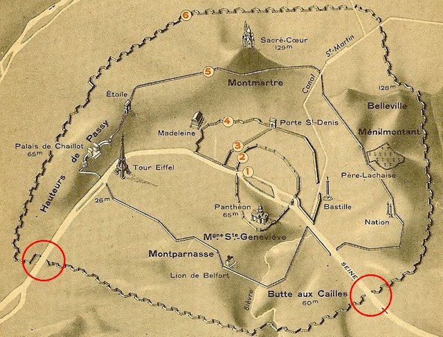 E ciò come riparazione "frettolosa" al fatto che Parigi si fosse privata della cinta muraria due secoli prima "E sono inevitabilmente incappato nella sua prematura distruzione (1660/1705)", salvo poi dire "Cos'è questa cintura verde (indicata dalle frecce in rosso) che cingeva Parigi nel 1860? Semplice è la cinta muraria di Thiers", per l'appunto "Per poi ricostruirne frettolosamente un altra più ampia nel XIX secolo, in concomitanza con la Torre Eiffel (che è stata, in principio, una torre di sorveglianza...)".
