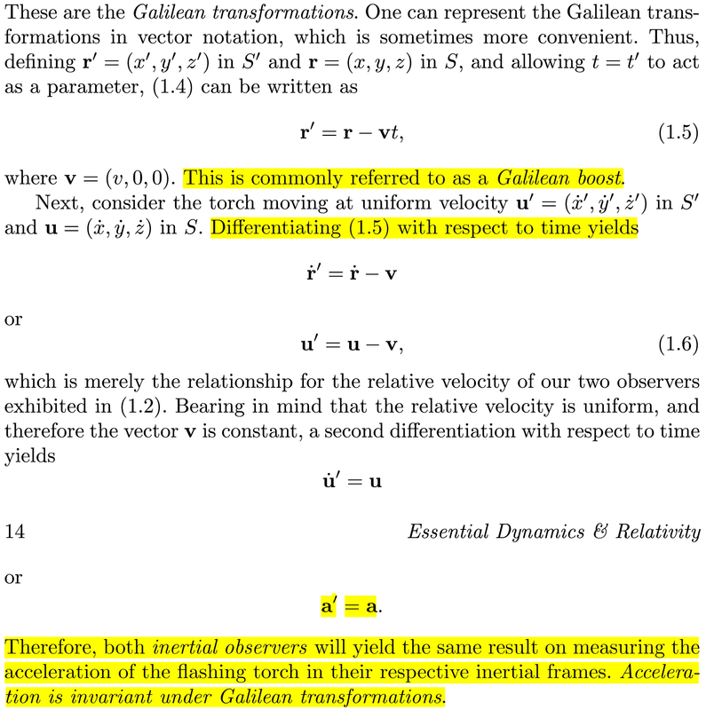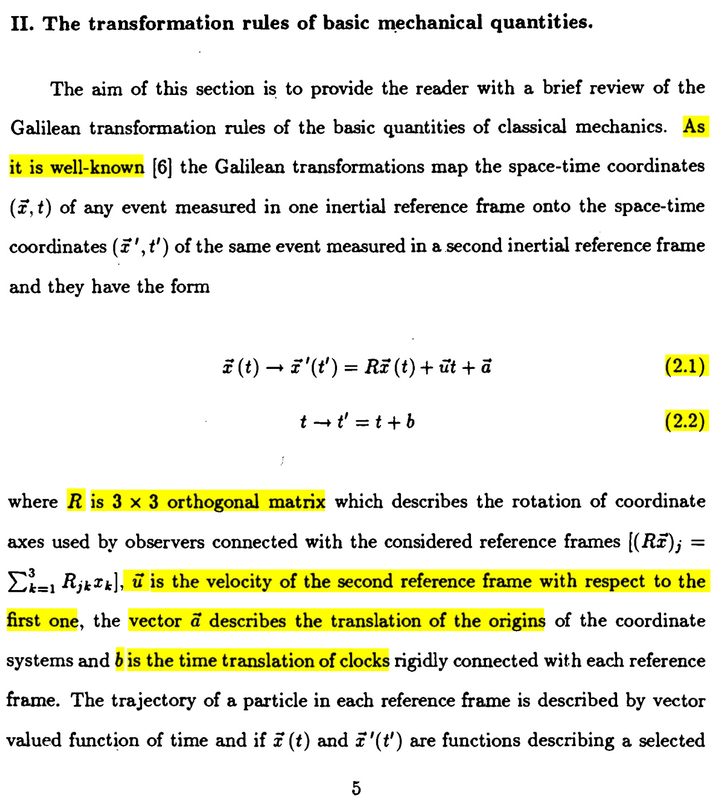 Affermazione: Le trasformazioni generalizzate di Galileo rappresentano l'omogeneità dello spazio e del tempo e l'isotropia dello spazio. Sempre da "Essential Dynamics and Relativity" Peter J. O’Donnell, CRC Press 1st Edition, pagina 15 e 16