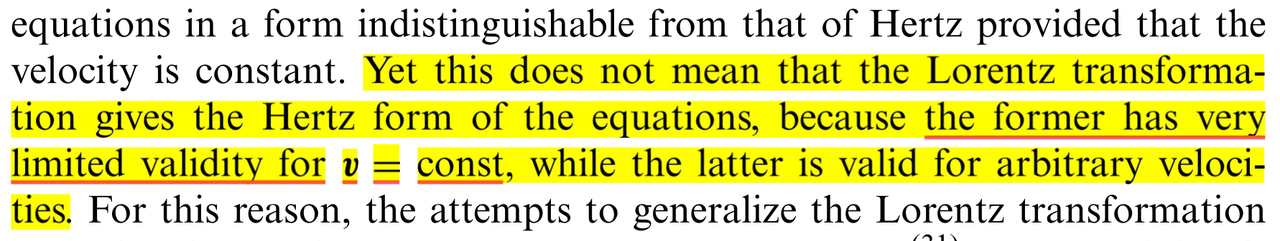 surprise surprise, che le equazioni di Maxwell-Lorentz non si possono ridurre alle equazioni di Maxwell-Hertz perché nelle prime a velocità v è costante, mentre nelle seconde la velocità è arbitraria. Ti giuro che non ci vuole una laurea in matematica applicata per capire che V = cost e v <> cost sono due grandezze diverse, bastano i due neuroni ben educati di cui sopra.
