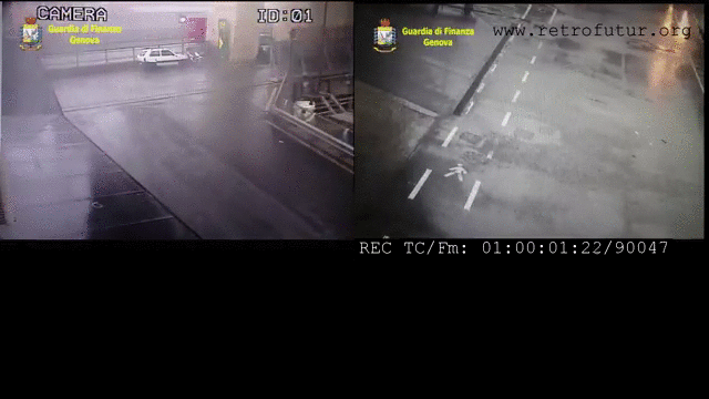 Su RF 6 (sec 44)si vede ancora il furgone bianco che poi sparisce dietro i detriti; la gerber che lo colpisce, dal suo lato dovrebbe essere arrivata a terra fra sec 45 e 46