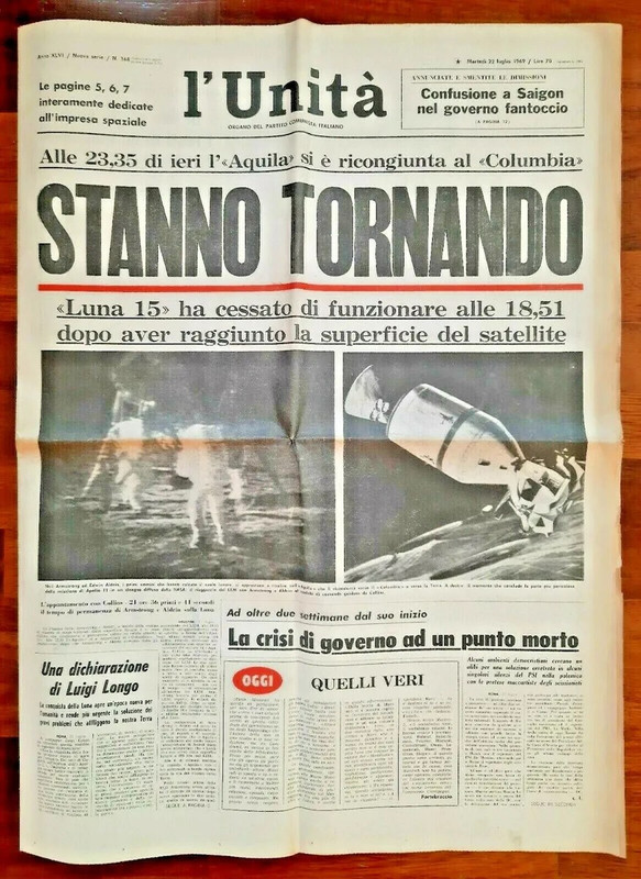 Puoi buttarla sul ridere, ma per l'URSS fu una sconfitta bruciante, aggravata dal fatto che sugli stessi giornali che incensavano la vittoria americana dovevano riportare il contemporaneo fallimento di Luna 15, doppio smacco per chi credeva nel "sol dell'avvenir". Ma che te lo dico a fare, tu non c'eri e non puoi capire. Ti metto questo giornale che ti può dare un'idea.lettura storica degna de Marvel, come se l'URSS fosse stata concepita con il solo scopo di vincere la gara lunare e poi, una volta persa (famo finta che gli USA la abbiano vinta), non potè sottrarsi al declino fino alla disgregazione degli stati... e il contributo de Rochi quarto nun ce lo volemo mette? : - )