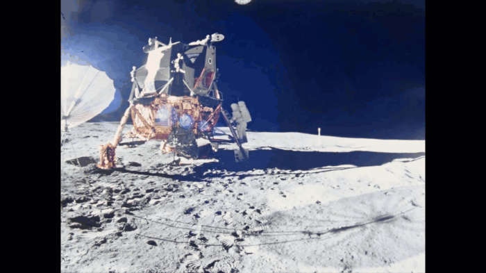 Questa sotto è una seconda gif, con Armstrong ripreso da Aldrin sul Lem, sempre con una cinepresa a pellicola, e che dimostra come la luminosità proveniente dal retro del lem era più che sufficiente ad illuminare perfettamente un astronauta in uscita dal Lem, e sicuramente non si vedono pannelli dietro all'astronauta.