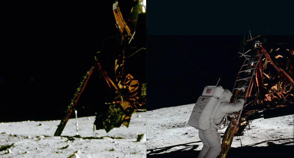 e da quell'oscurità del retro del LEM dimostra che non c'era bisogno di pannelli per rischiararlo, bastava aprire il diaframma ponendo il medesimo terreno alla stessa luminanza per ottenere la luminosità del Lem da cui Aldrin era disceso.