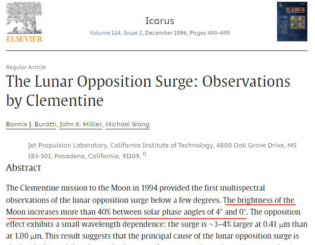 L'ho visto quel documento, ma, come da me detto, non è ne della NASA nè di altra agenzia spaziale www.sciencedirect.com/science/article/abs/pii/S0019103596902250 oltre al fatto che quel documento dice che la luminosità del terreno potrebbe aumentare del 40%, NON che diventa del 40%!!! Il 40% in più rispetto all'8%, significa un 12% scarso (più 11 che 12, essendo dell'11,2). Quelle che dici, sono tue elucubrazioni, tu parti dal fatto che le foto son state fatte sulla Luna, allora devi partire con calcoli, angoli di fase, altezze dell'illuminazione all'orizzonte, retroilluminazioni della regolite, ecc. Ma non hai nulla in mano, a livello ufficiale. O fai validare le tue tesi dalla NASA, e/o simili, oppure almeno da qualche eminente esperto indipendente di livello internazionale. Altrimenti sbatti contro la NASA stessa. E infatti, ci sarà pure un motivo se Mazzucco cita sempre o esperti del settore, oppure documenti ufficiali, per portare avanti le sue tesi.