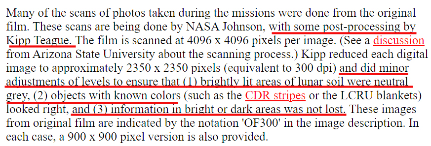 Io non ho mai affermato che quelli fossero "gli scan originali". Non posso averlo detto, perchè NON so che cazzo abbiano scannerizzato alla NASA. Io all'inizio del film dico "Tutte le foto analizzate sono originali NASA presi dal sito Project Apollo Image Gallery". Nel senso che IO NON LE HO RITOCCATE, quelli che vedete sono gli originali NASA scaricati dal loro sito. Questo intende dire il cartello iniziale.EGILOS: tutta la tua parte dedicata alle foto in American Moon partiva da un presupposto: le scansioni dell'Apollo Journal erano "originali", ossia mostravano il vero aspetto delle pellicole.