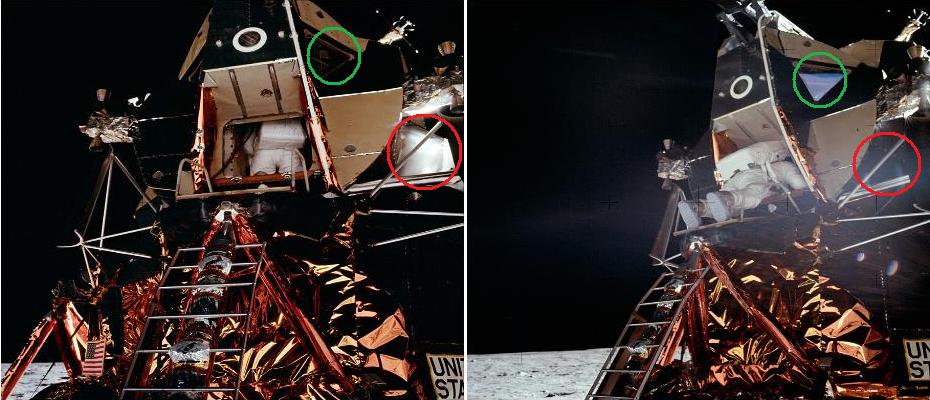 Qui vediamo benissimo che l'asta verticale era piegata verso il LEM e quella orizzontale ovviamente voleva stare più in basso possibile, ossia nel suo punto di equilibrio gravitazionale.