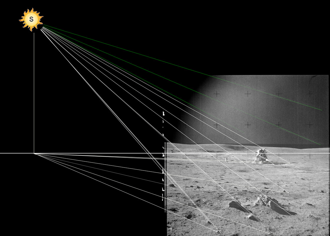 Adesso applichiamo correttamente la teoria delle ombre all’immagine della Nasa, avvalendoci, oltre che delle ombre, anche della direzione dei raggi nella foto: otterremo l’esatta posizione della fonte luminosa nella foto stabilendo l’orizzonte ottico e il punto di fuga perpendicolare alla posizione del Sole. Come possiamo osservare la posizione del Sole è perfettamente compatibile con l’ombra prodotta dal paraluce e con la direzione dei raggi solari già presenti nell’immagine, ma non solo, la linea dell’orizzonte individuata, è molto vicina alle crocette centrali del reseau plate della fotocamera, crocette che dovrebbero indicare l’orizzonte ottico nel caso in cui la fotocamera fosse fissata su di un treppiede e con l'obiettivo perfettamente parallelo al terreno. Visto che l’astronauta che ha scattato la foto non era un cavalletto, quella ottenuta è davvero un’ottima coincidenza. Come vediamo il documentario con i suoi consulenti fotografi di moda, non sapendo applicare correttamente la teoria delle ombre, non sono stati in grado di stabilire l'esatta posizione del sole.