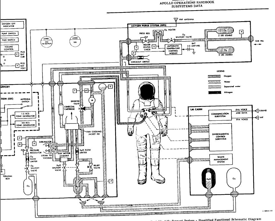 Su questa valvola di sfogo mi domando: funzionava in automatico, o bisognava azionarla manualmente? E perchè mai serviva, in ogni caso? Cosa può far salire la pressione interna al punto tale di doverla scaricare all'esterno (perdendo ossigeno prezioso, fra l'altro)? Non sarebbe stato meglio abbassare temporaneamente il compressore interno, invece di gettare via dell'ossigeno che puoi non recuperi più?l’emissione di ossigeno dalla valvola di sfogo della tuta (pressure relief valve), posizionata sulla manica sinistra, quella più vicina alla bandiera, e rivolta sul davanti, e la cui emissione di gas può precedere l’astronauta, considerando anche l’alta velocità con cui le molecole di gas si muovono nel vuoto e dove la corsa può aver modificato la pressione interna della tuta, richiedendo una regolazione.